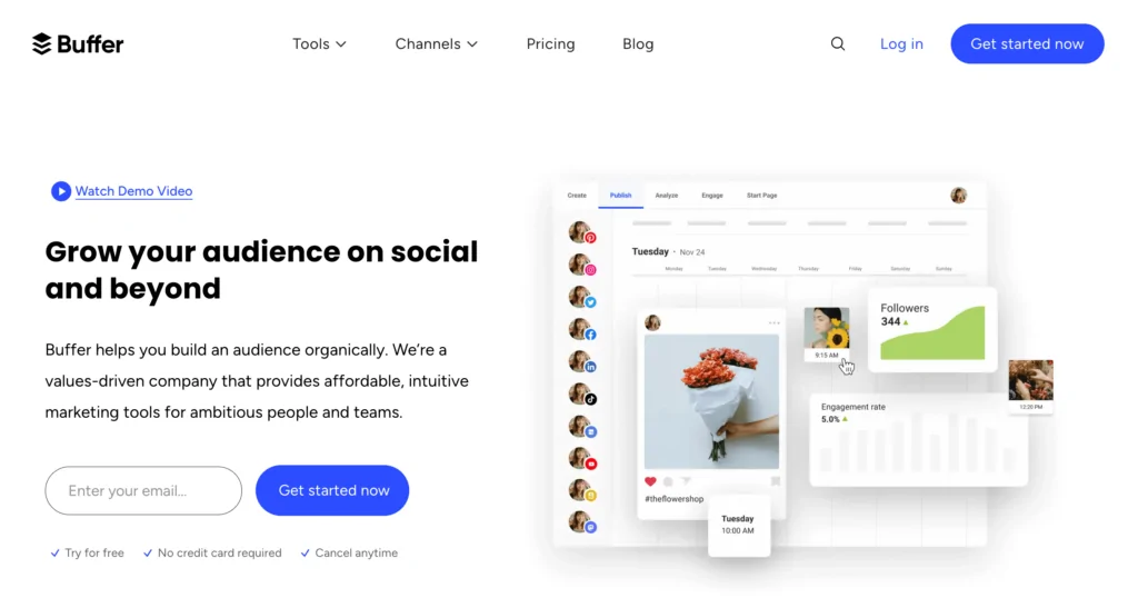 Buffer | Easy scheduling, AI assistant, the best time to post, hashtag manager | Free up to 3 channels. Essentials plan starts at $5 monthly per social channel |