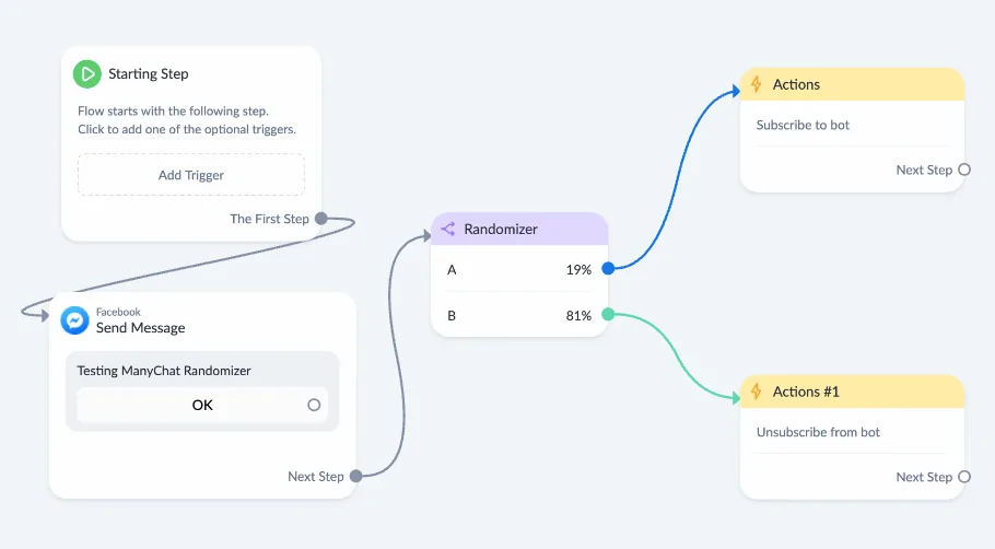 Manychat’s A/B testing is facilitated by the Randomizer, a tool that tests messages, button text, or entire flows.