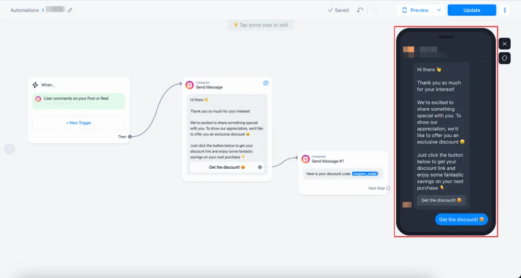 ☝️My tip: Two of my favorite pre-built templates include converting comments into sales and using Instagram stories to generate more leads. Both of these templates work by setting up a specific keyword that users comment or DM, triggering an automated message to their DMs and starting a conversation. I love using this method to offer a free ebook and collect email addresses quickly and efficiently.