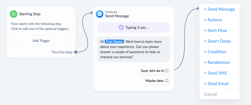 - Visual interface: The flow builder provides a canvas to drag and connect different elements like messages, actions, and conditions, creating a seamless conversation flow.