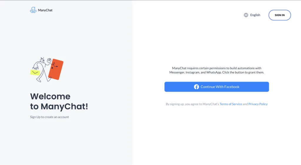 Visit the Manychat website and click on the Sign Up button. For now, there’s only one sign-up option: Continue with Facebook – you need an active Facebook account to create your profile.