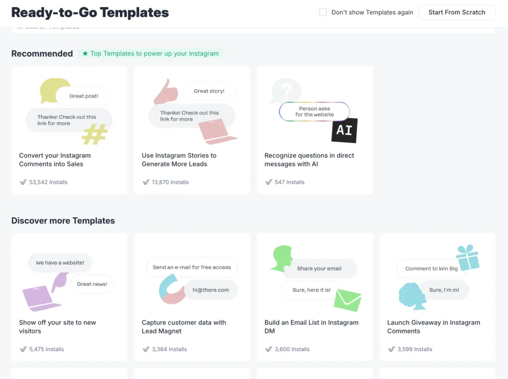 Manychat offers a range of pre-built templates designed to help you quickly set up and deploy chatbots for various purposes. You can customize them to your brand’s voice and requirements.